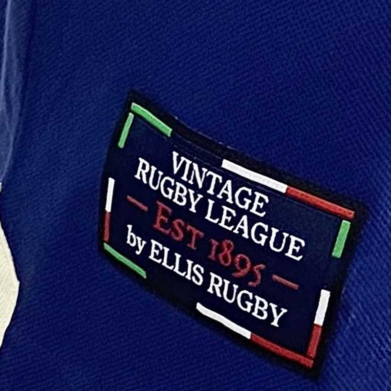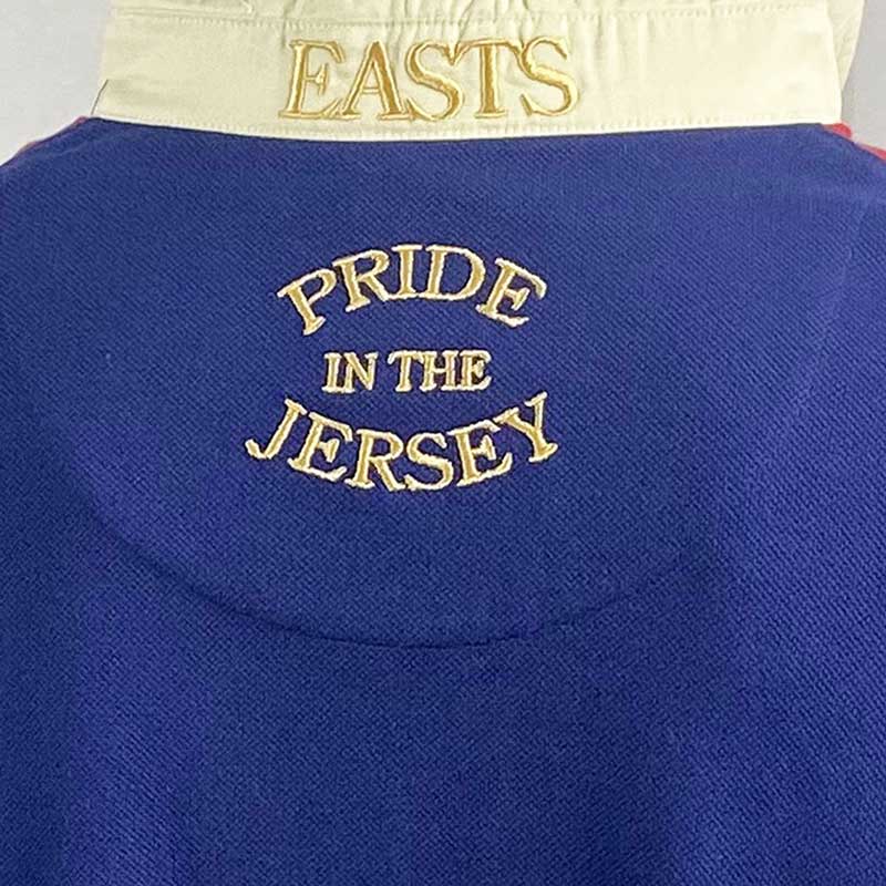 Een vintage Eastern Suburbs-clublogo is prominent aanwezig, een knipoog naar de rijke geschiedenis van het team. Het driekleurige patroon op de mouwen voegt een dynamische flair toe. ‘EASTS’ is in goud geborduurd op de achterkant, symbool voor trots en uitmuntendheid. Een geweven label bij de zoom versterkt de stijlvolle uitstraling van het kledingstuk.